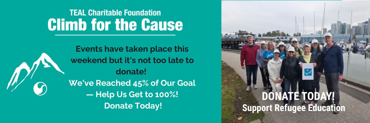 The TEAL Charitable Foundation (TCF) is dedicated to promoting the teaching and learning of English as an additional language. Currently, the TCF is fundraising for awards for refugees who wish to study at post-secondary institutions. Over the years, many refugees have arrived in Canada from war-torn countries, have missed critical years of education, and have not had the financial resources to study at a post-secondary level. The TEAL Charitable Foundation established an award program for refugees in 2012 in order to provide financial support for refugees in need who wish to study at post-secondary institutions in BC. Over the years, the TCF awards have provided many refugees with the opportunity to not only study at post-secondary institutions but also make a real and lasting difference in their lives and their futures.